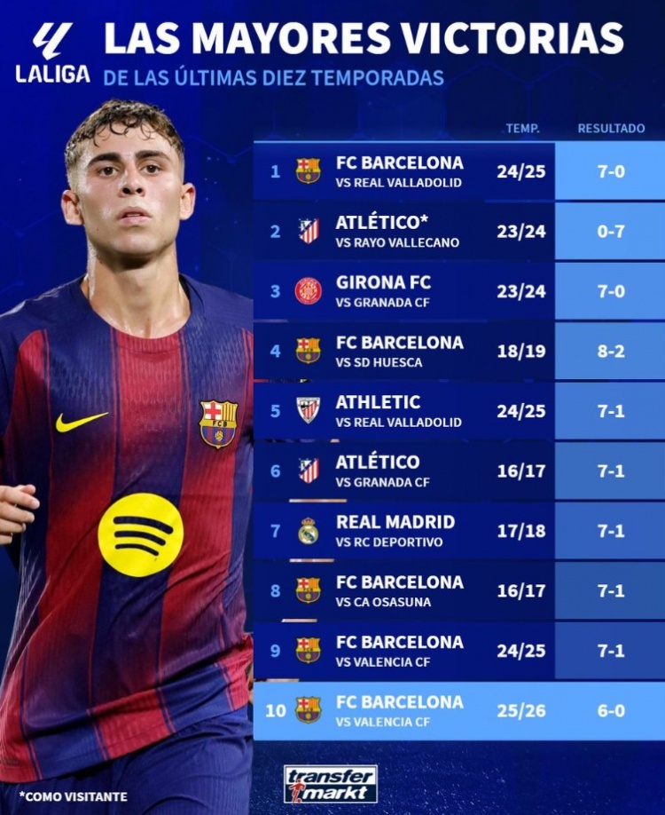 西甲近10赛季最大比分赢球:巴萨5上榜,瓦伦西亚两次成配景板