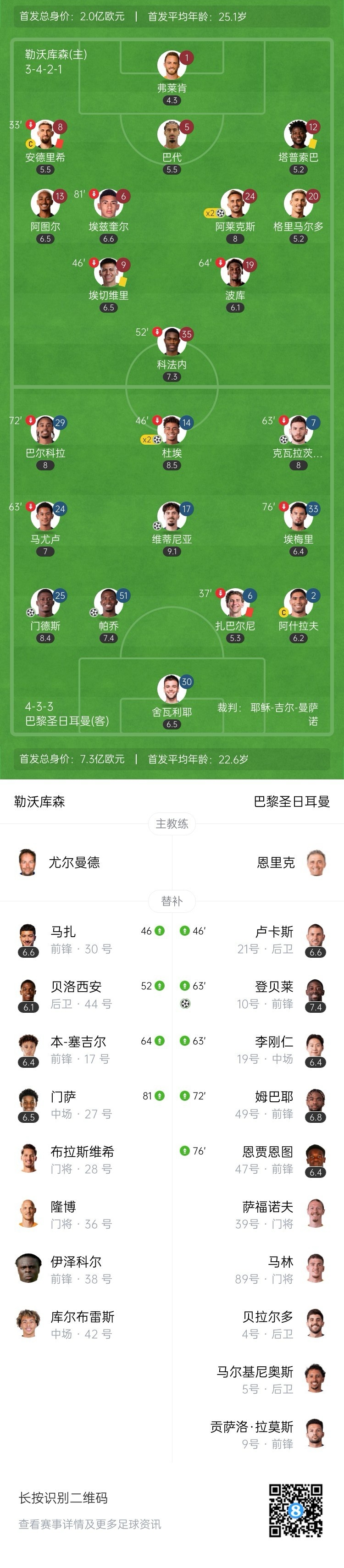 本场比赛上半场比分已是巴黎4-1勒沃库森,两边此时都是十东谈主作战。下半场卓越的巴黎却皆备充公手,除了换上卢卡斯(因扎巴尔尼红牌)补充后防外,其余上阵的替补全是先锋:登贝莱、李刚仁、姆巴耶、恩贾恩图。最终巴黎下半场又轰3球,全场比分7-2。