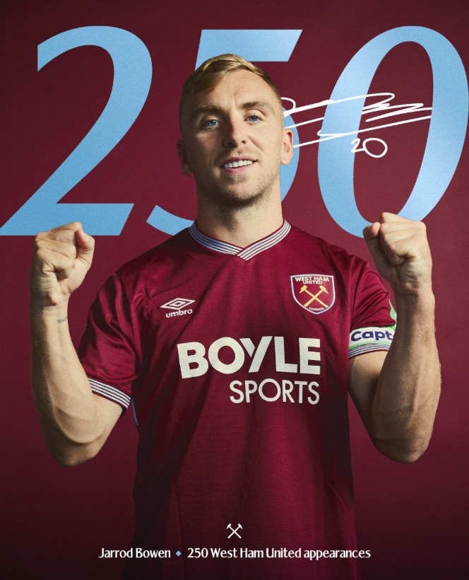 本赛季3球2助,鲍文迎西汉姆联糊口250场里程碑之战