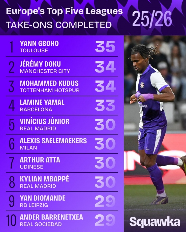 五大联赛顺利过东说念主榜:多库、库杜斯均第二 亚马尔、维尼修斯在列
