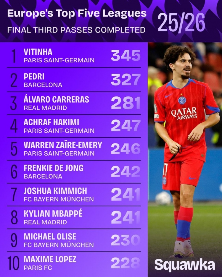 345次!维蒂尼亚的迫切三区完成传球次数位列五大联赛第一