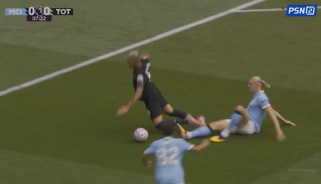 08月23日讯 英超第二轮,曼城镇守主场对阵热刺,比赛第8分钟,哈兰德回撤接球被罗梅罗抢断,随后铲倒理查利森,裁判吹罚犯规。