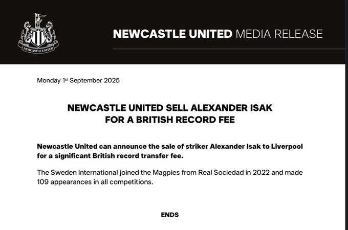 纽卡斯尔官方也发表了伊萨克转会的官方公告,但实质仅37个单词。记者Keith Downie对此发文点评。
