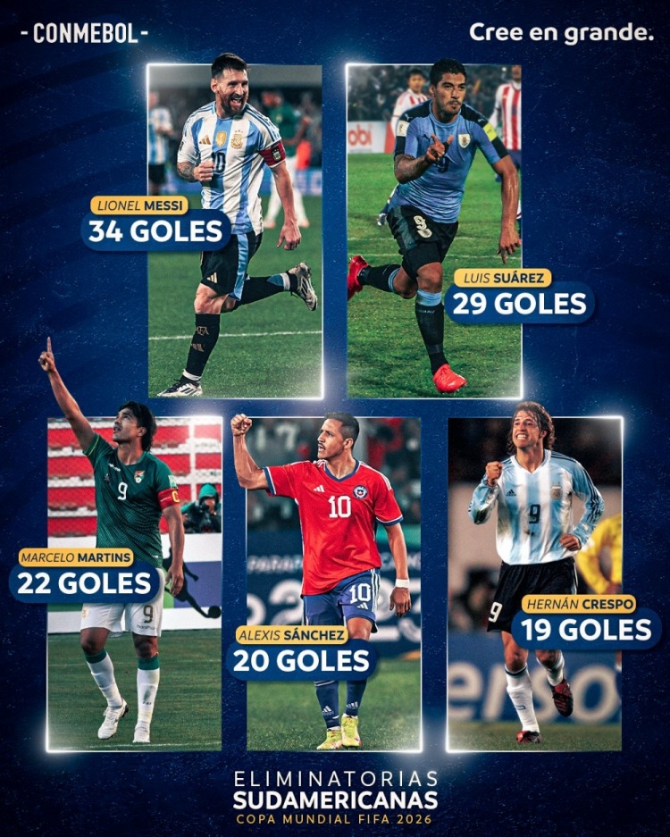 9月5日讯 南好意思足联官方列出了南好意思世初赛历史弓手榜,梅西34球居首,苏亚雷斯29球次席。