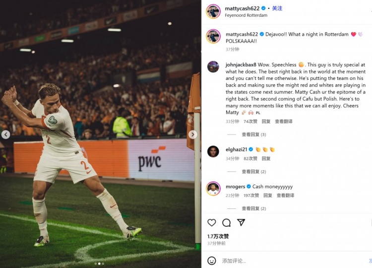 他也在赛后通过社媒晒出我方的高尔夫挥杆庆祝照,并配文:“似曾见地!鹿特丹之夜晚确切棒极了❤️🤍波兰队!”