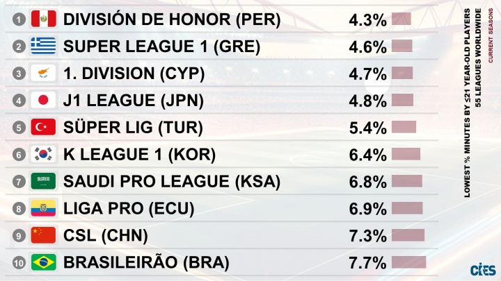 10月18日讯 近日,足球巨擘统计机构CIES发布最新统计,大众55个联赛中U21球员出场技能占比最少的联赛,秘鲁联赛4.3%居首,J联赛4.8%第4,K联赛6.4%第6,中超7.3%第9。
