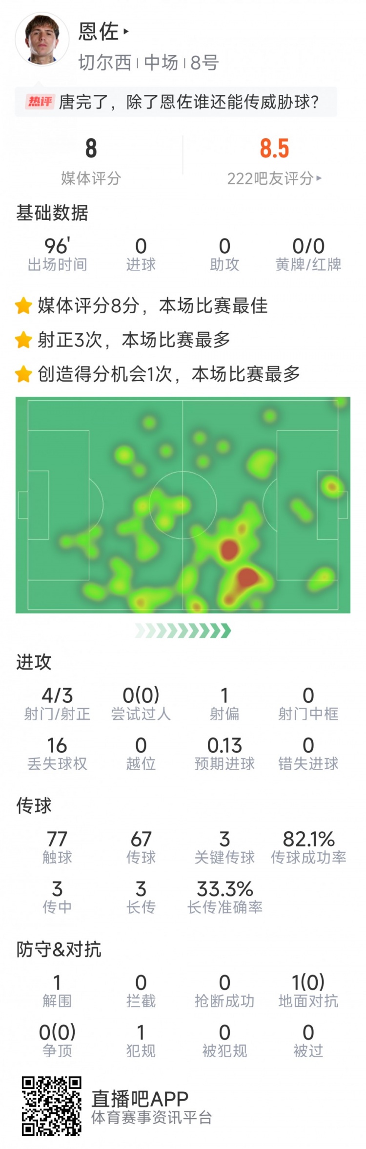 难挽败局,恩佐本场数据:3次重要传球,4射3正,评分8分全场最高