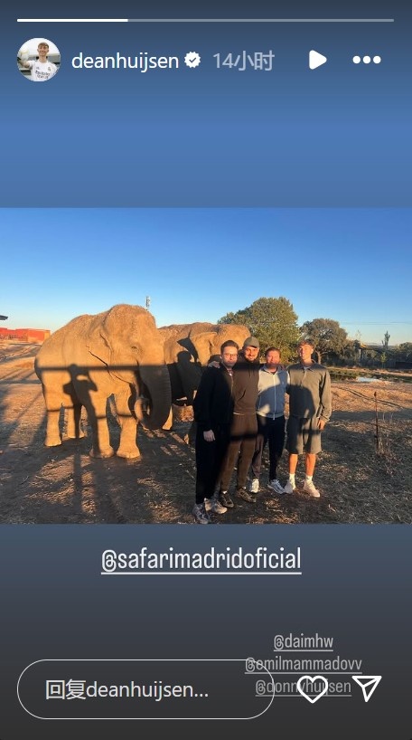 当地时辰周一,皇马后卫赫伊森与亲一又赶赴马德里野灵活物园游览,他在个东说念主社媒晒出与大象的合照。