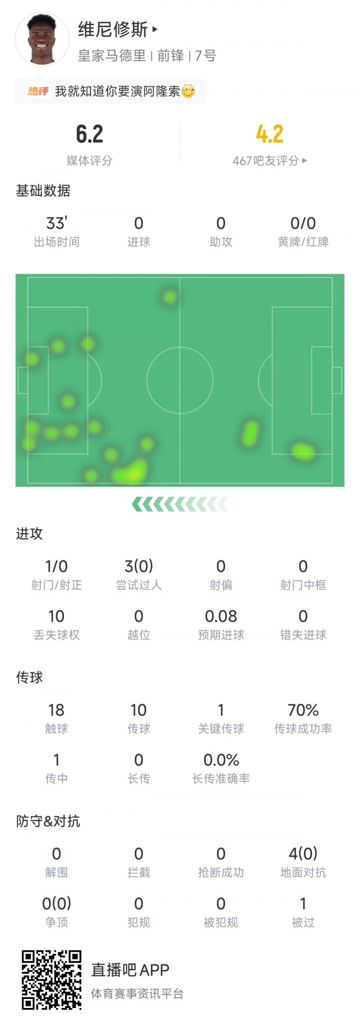 维尼修斯这场比赛发扬欠安,3次过东说念主0告捷,4次扞拒0告捷,18次触球丢了10次球权,赛后评分独一6.2分。