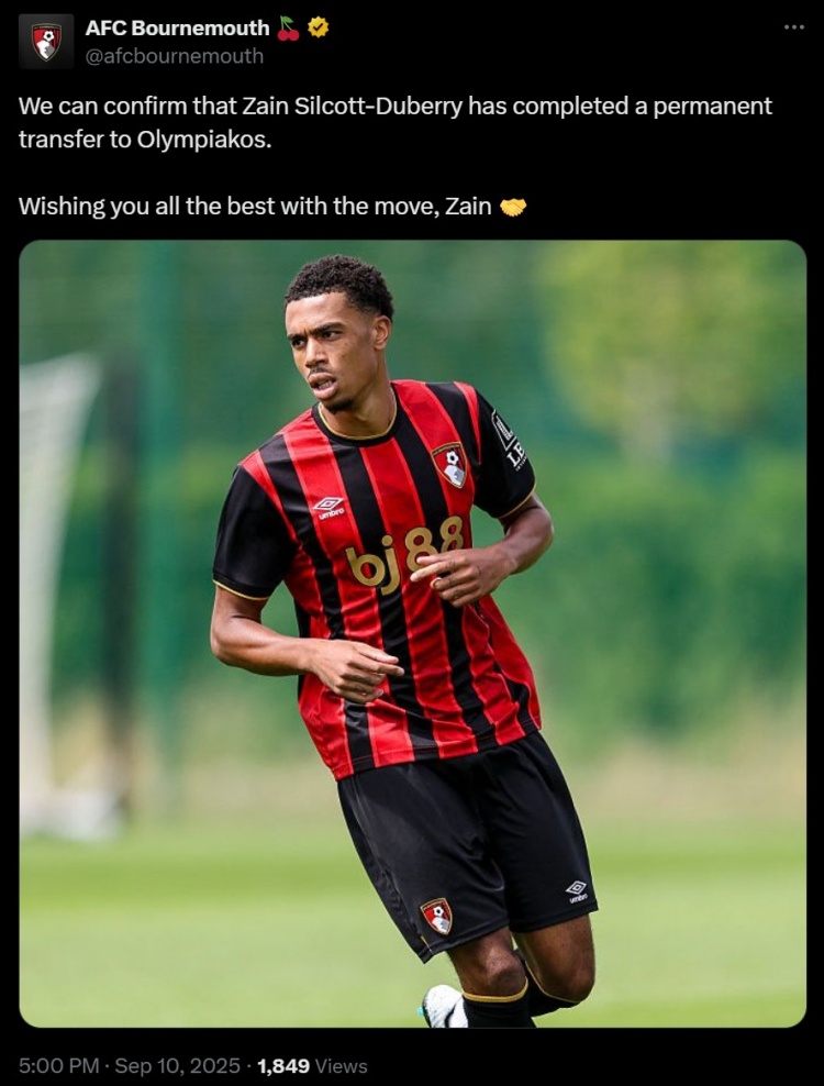 官方:伯恩茅斯20岁边锋杜伯里长期转会至奥林匹亚科斯