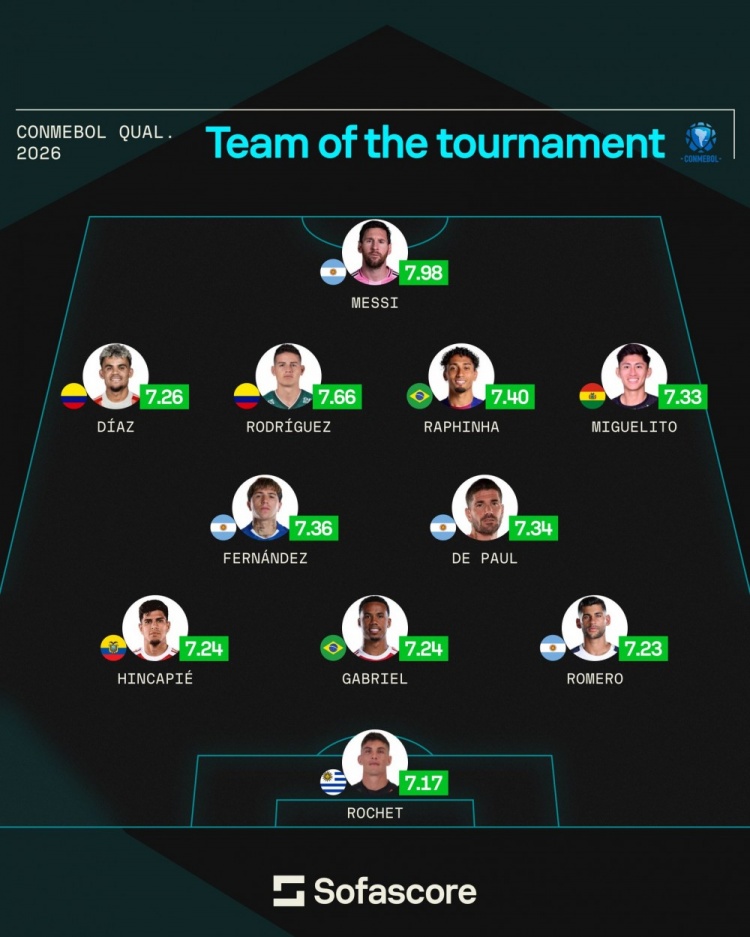 Sofascore南好意思世初赛最好阵:梅西领衔,拉菲尼亚、恩佐、J罗在列