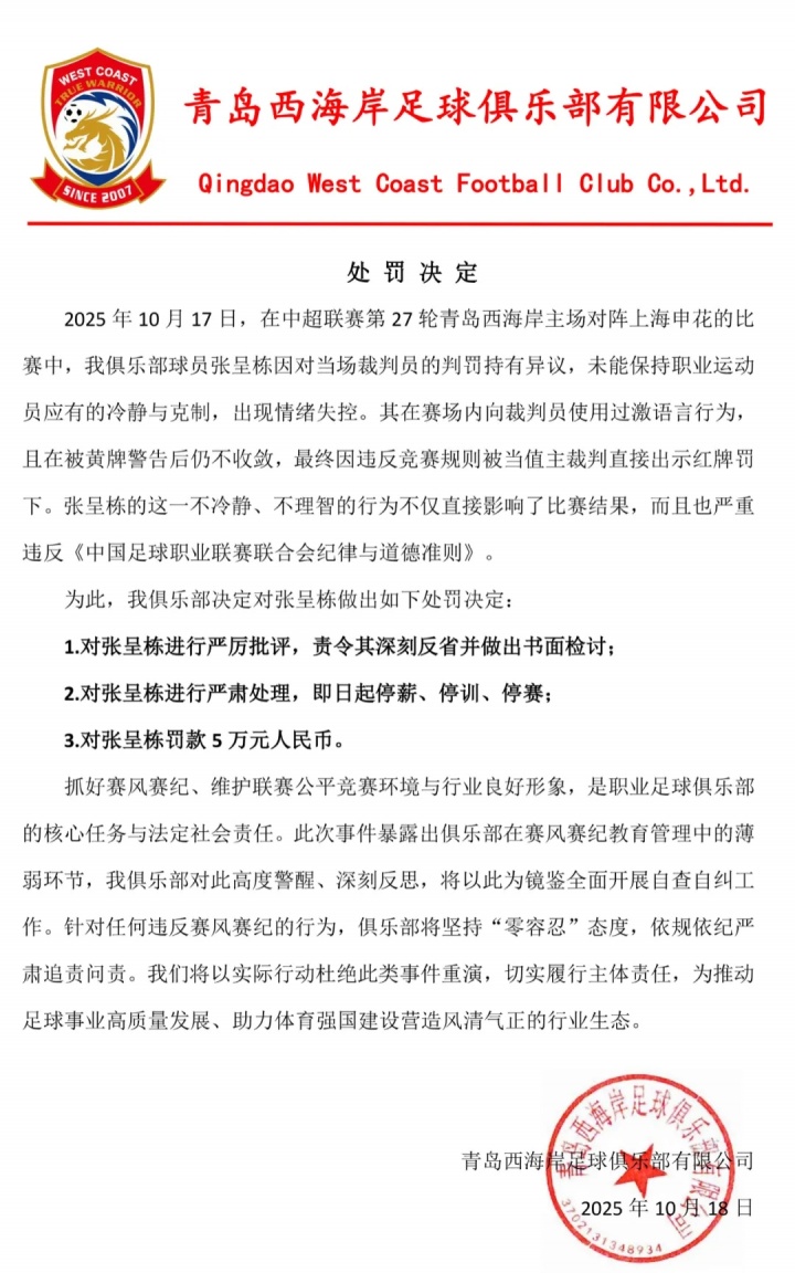 10月18日,青岛西海岸官方发布对张呈栋的处罚决定: