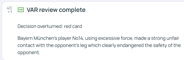 “决定推翻:红牌。拜仁14号球员使用过度力量,与对方球员腿部发生彰着不正大斗殴,严重危及对方球员安全。”