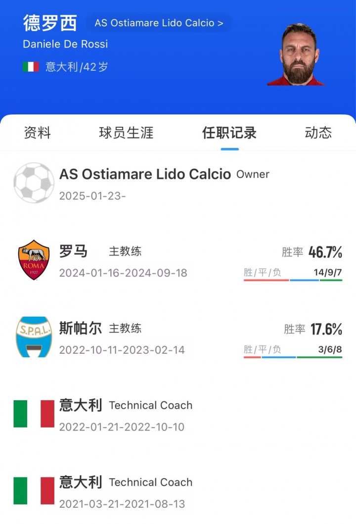 42岁的德罗西曾担任斯帕尔、罗马主帅,执教罗马技能战绩14胜9平7负。