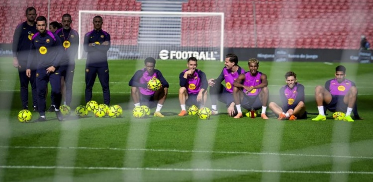 球员们分红三组进行传球教育,之后进行了小场比赛,分为两队:穿绿背心和不穿绿背心,两名中场(德容和奥尔莫)轮流。穿绿背心的一方有:费兰-托雷斯、亚马尔、德罗、库巴西、克里斯滕森、巴尔德、卡萨多和埃斯帕特。不穿绿背心的一方有:阿劳霍、埃里克-加西亚(戴着面具)、拉什福德、托尼、伯纳尔、费尔明、巴德吉、莱万和托伦茨。