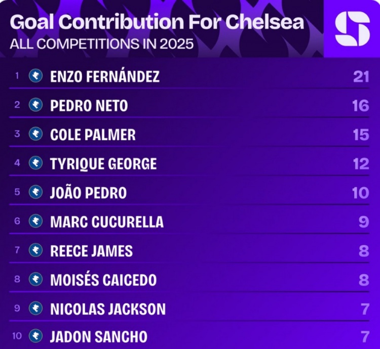 据Squawka统计,恩佐·费尔南德斯2025年打进11球,助攻10次,他是切尔西队内同时唯独进球、助攻齐上双的球员。