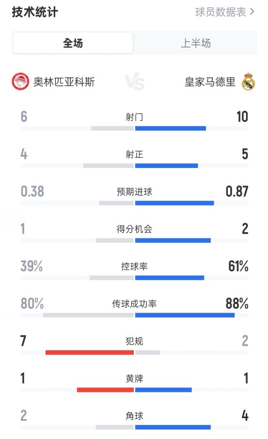 奥林匹亚科斯半场1-3皇马数据:射门6-10,射正4-5,控球39%-61%