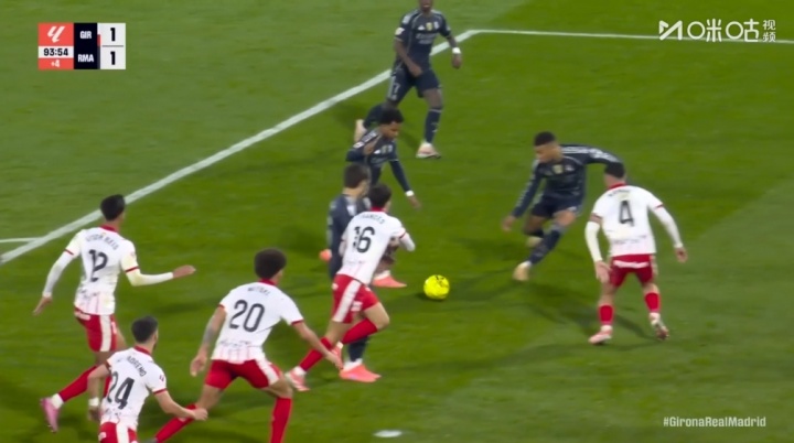 西甲第14轮,皇马客场1-1战平赫罗纳,读秒阶段皇马获取绝杀契机,贝林厄姆禁区横敲,正对球门的罗德里戈调遣步点准备射门,这时正对来球但侧对球门的姆巴佩中途杀出,回身兜射打偏。