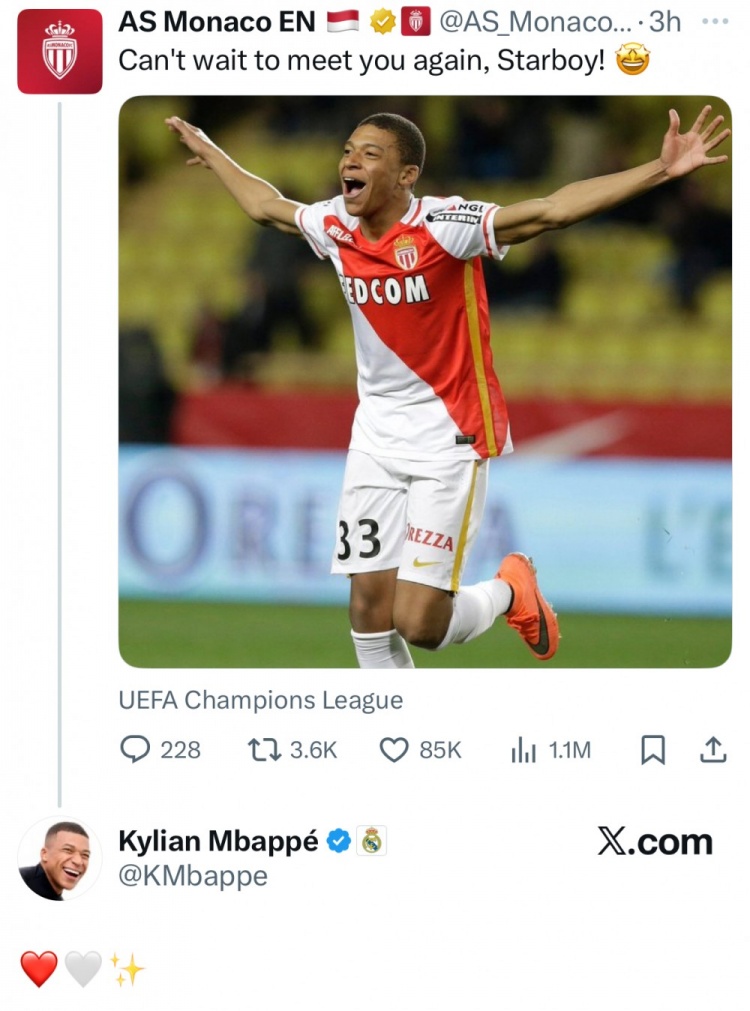 摩纳哥社媒晒姆巴佩青涩照:迫不足待念念见你,后者恢复:❤️🤍