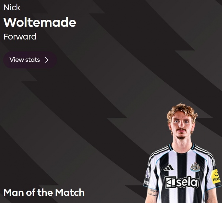 承接4场破门,英超官方:沃尔特马德当选纽卡1-2布莱顿全场最好