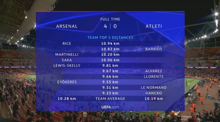 赛后两队跑动数据线路,阿森纳全队平均跑动距离为10.28KM略高于马竞的10.19KM。然则,在跑动距离逾越10KM的球员中,阿森纳有3东谈主,分手为赖斯(全场最高10.94KM)、马丁内利和萨卡,而马竞仅有1东谈主为巴里奥斯。