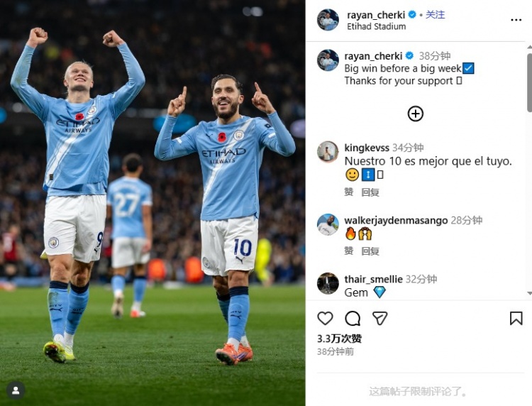 谢尔基晒出与哈兰德的合影,并配文写谈:“焦虑的一周前,一场焦虑的告捷。感谢你们的补助。”