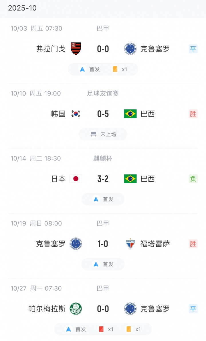战日本狂直立!克鲁塞罗中卫布鲁诺入选巴西名单,上轮联赛刚染红