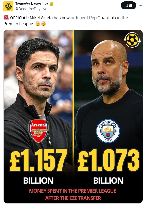 这笔转会敲定后,有媒体称阿尔特塔在英超的耗尽也曾达到11.57亿镑,杰出了瓜迪奥拉(10.73亿镑),但这个报谈遭到德转打脸。