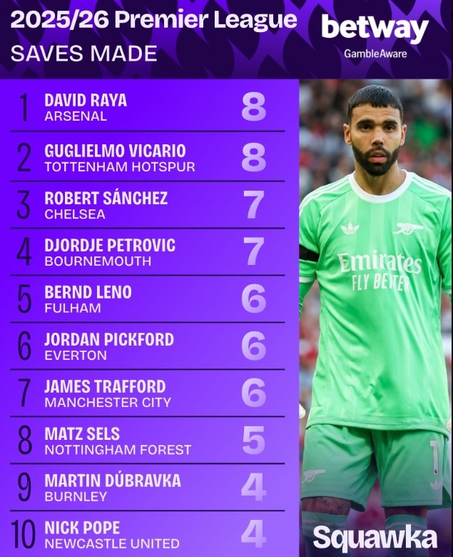 8月28日讯 本赛季英超照旧进行两轮比赛,阿森纳的拉亚和热刺的维卡里奥以8次比肩扑救榜榜首,何况两东谈主把守的球门迄今截止还未丢球。