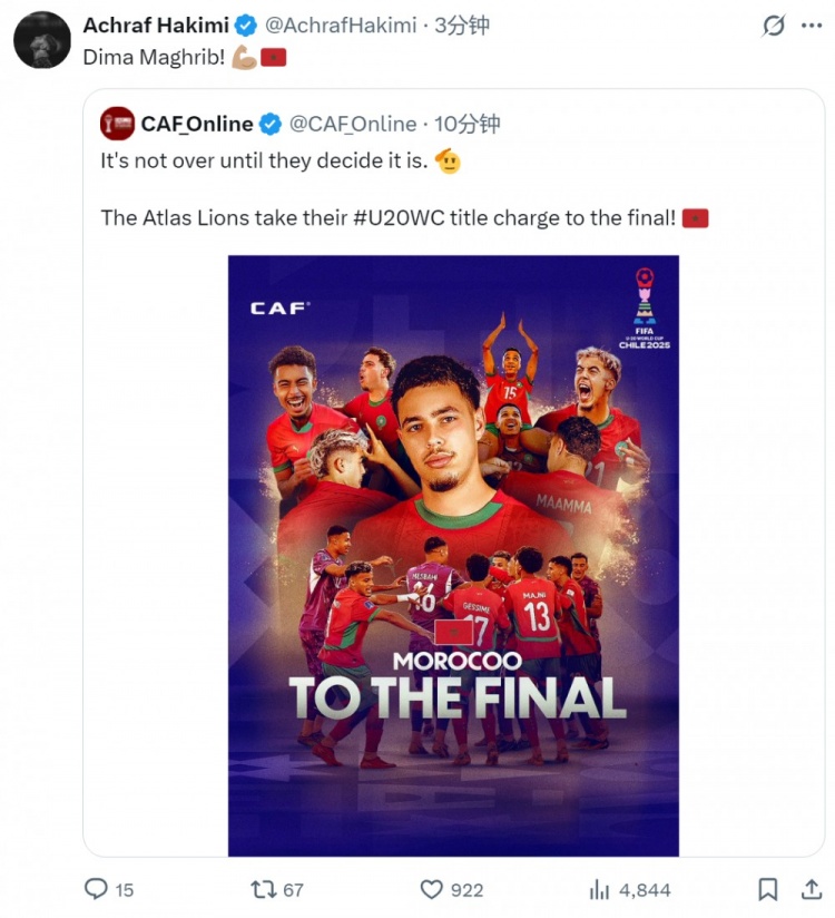 摩洛哥插足世青赛决赛,阿什拉夫转发海报道喜:摩洛哥加油