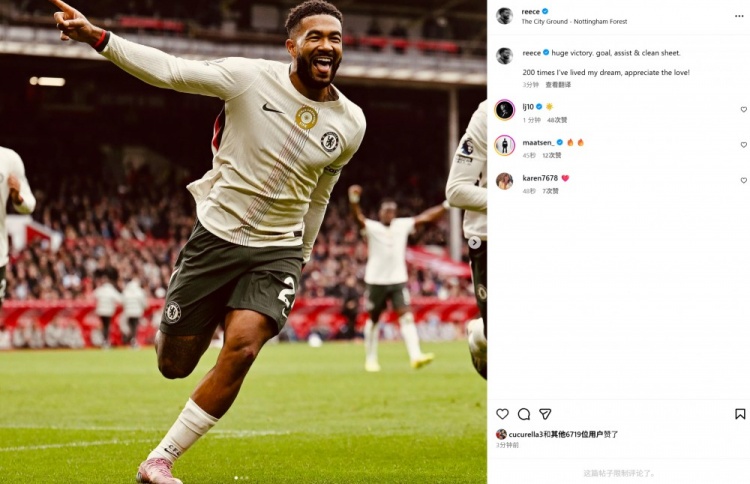 本场比赛里斯-詹姆斯迎来球队生计200场里程碑,而且传射立功。他在赛后社媒晒照写谈:“一场大捷,而且得到进球和助攻,完成零封,200次出场罢了梦念念,感谢天下的爱!”