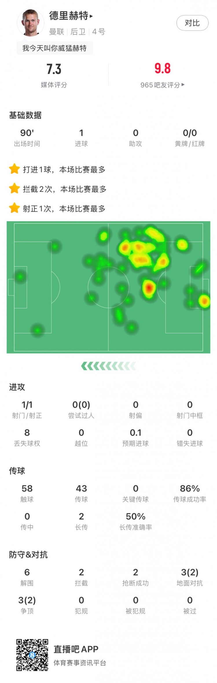 永不捣毁!德里赫特全场数据:绝平+6突围2羁系2抢断,获评7.3分