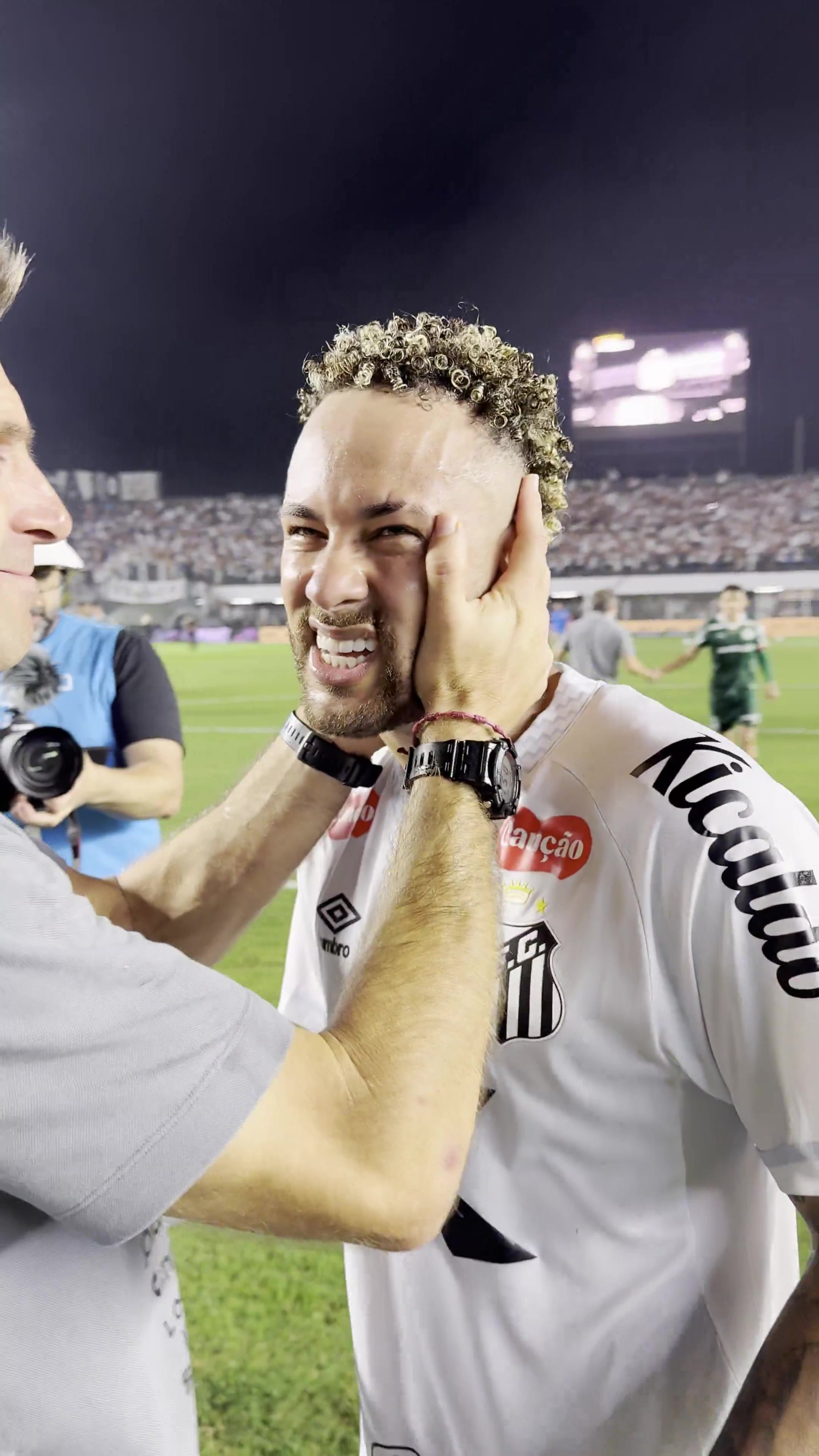 内马尔赛后与队友逐个拥抱,庆祝球队取胜。