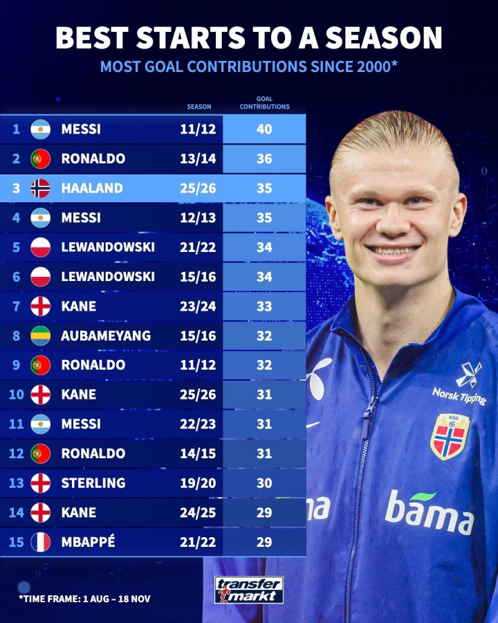 11月20日讯 德转统计了本世纪赛季开局的进球孝敬数,哈兰德以35粒进球位居历史第三,仅次于梅西和C罗。