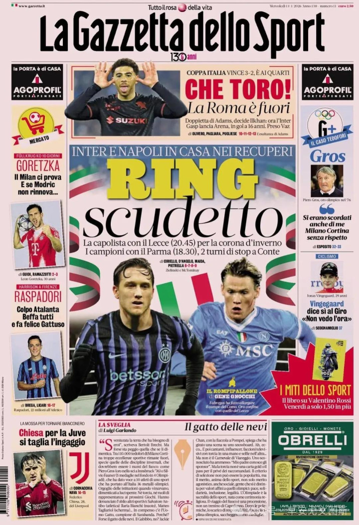 3、拉斯帕多里-亚特兰大,加斯佩里尼的又一记耳光。马尔蒂尼行将离开,卢克曼之谜。罗马得到瓦斯和马伦。佛罗伦萨:哈里森。热那亚:巴尔丹都。