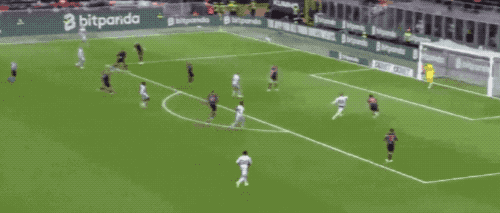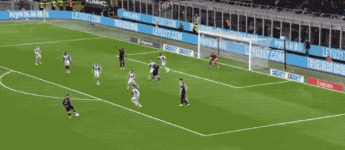 第36分钟,帕夫洛维奇外脚背撩射,皮球划过一道优美的弧线,越过足球守门高手防守员头顶,米兰取得领先。