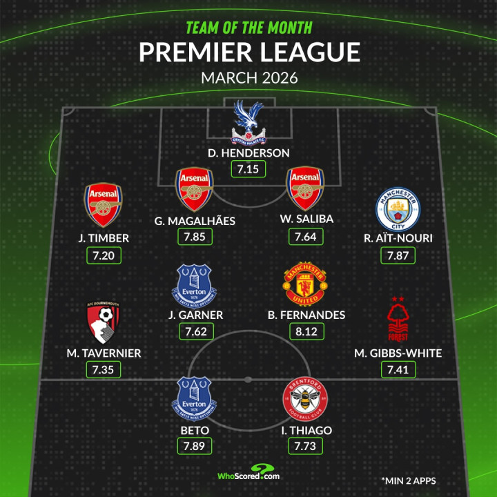 WS英超3月份评分最高阵形 : B费领衔, 阿森纳后防3将入选