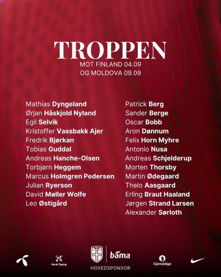 挪威国度队9月大名单:哈兰德、厄德高、鲍勃、索尔洛特在列