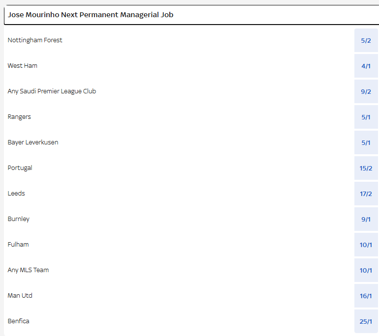 穆里尼奥下个看成安稳主教练捏教的球队赔率: