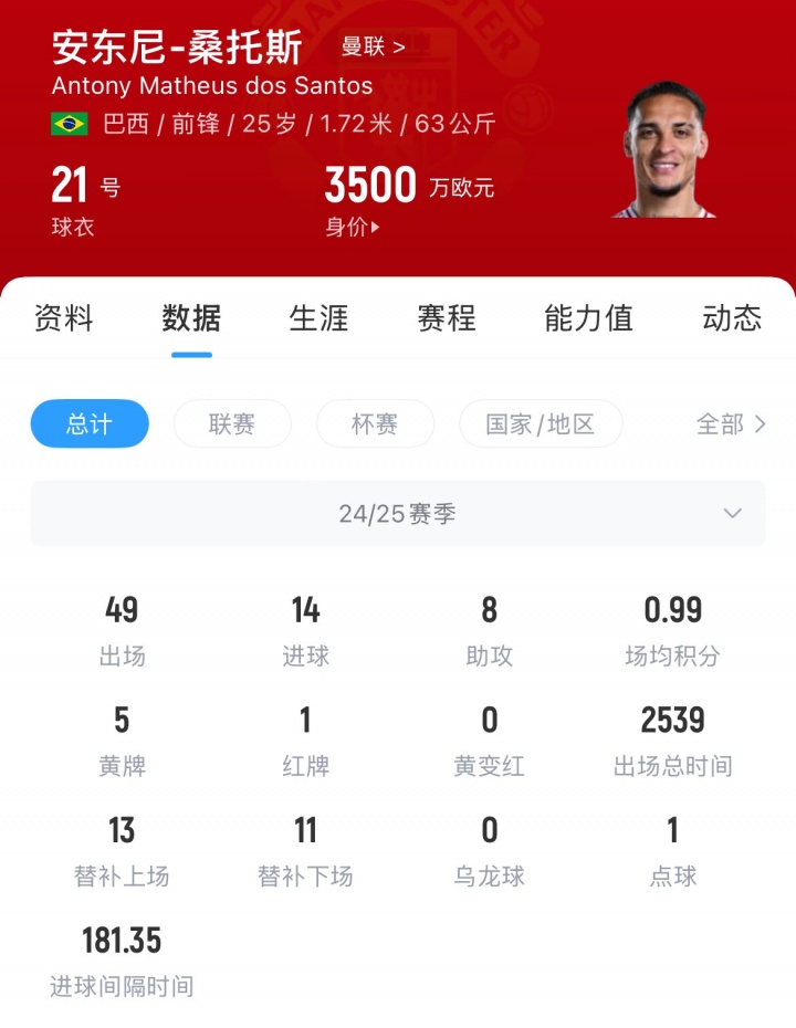 安东尼上赛季各赛事共出战49场,打进14球助攻8次。租出贝蒂斯本领,安东尼屡次示爱贝蒂斯,抒发留住意愿。