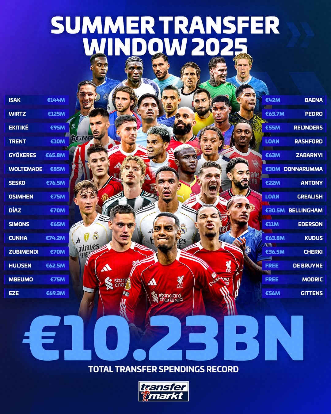 2025年足坛夏窗总开销超百亿欧 英超超35亿欧 意甲唯二超10亿欧