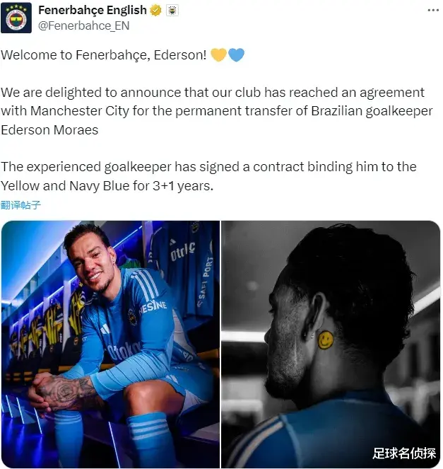 官方:费内巴切文牍从曼城签下了埃德森,这名门将签下了一份3+1合同。