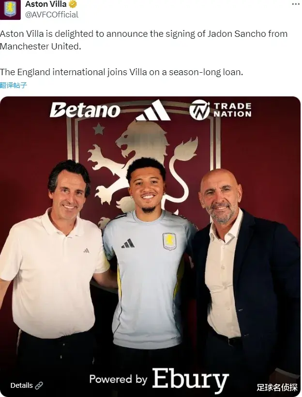 官方:维拉文牍从曼联租赁桑乔一个赛季。