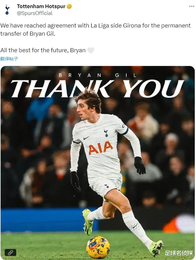 官方:热刺文牍和赫罗纳就布莱恩-吉尔的转会终剖释公约。