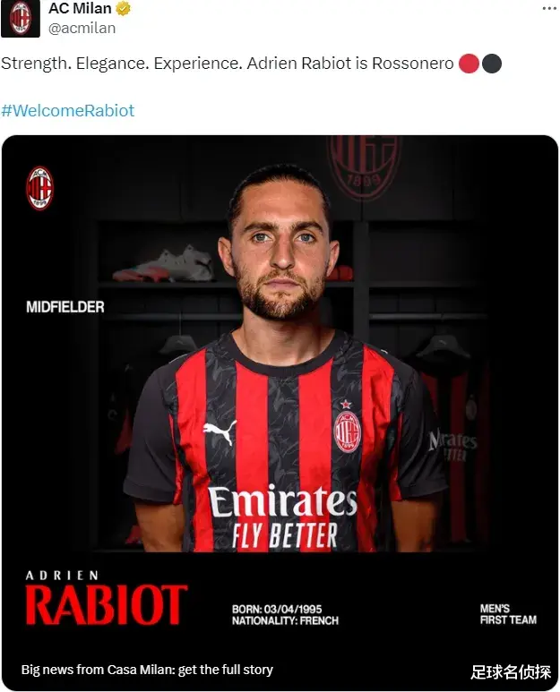 官方:米兰文牍从马赛签下了拉比奥特,两边签下了一份4年合同。