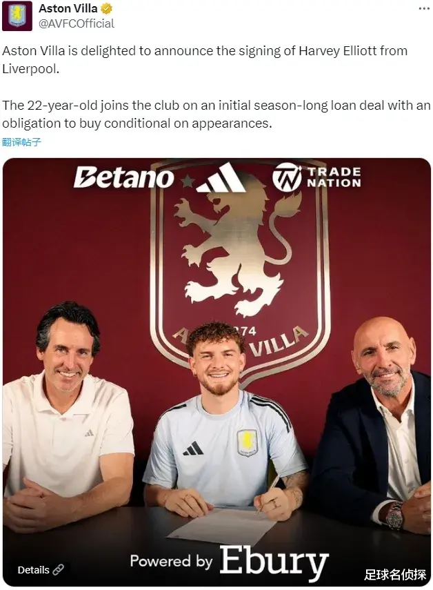 官方:维拉文牍从利物浦签下了22岁的哈维-埃利奥特。
