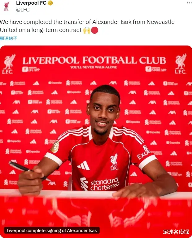 官方:利物浦文牍从纽卡斯尔签下了伊萨克。