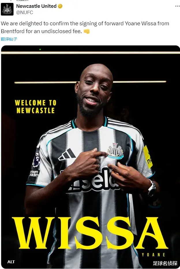 官方:纽卡斯尔文牍从布伦特福德签下了维萨,这名先锋签下了一份4年合同。