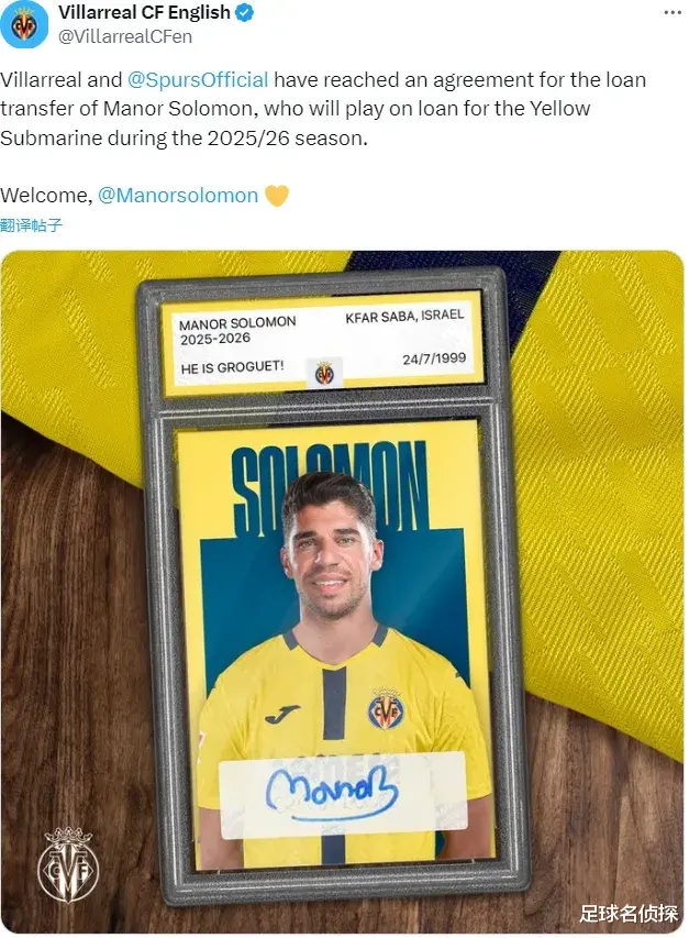 官方:比利亚雷亚尔文牍从热刺租赁所罗门一个赛季。