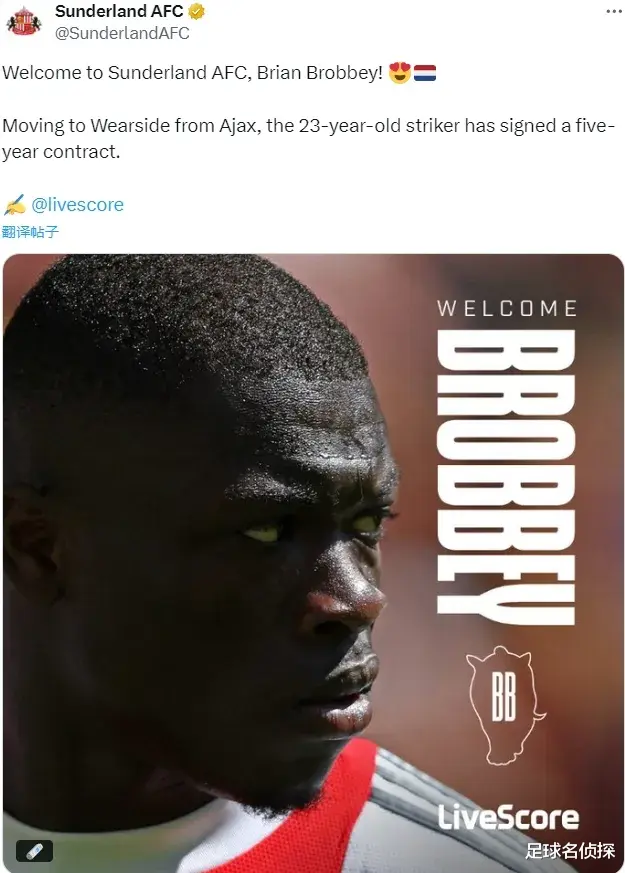 官方:桑德兰文牍从阿贾克斯签下了布莱恩-布罗比,两边签下了一份5年合同。